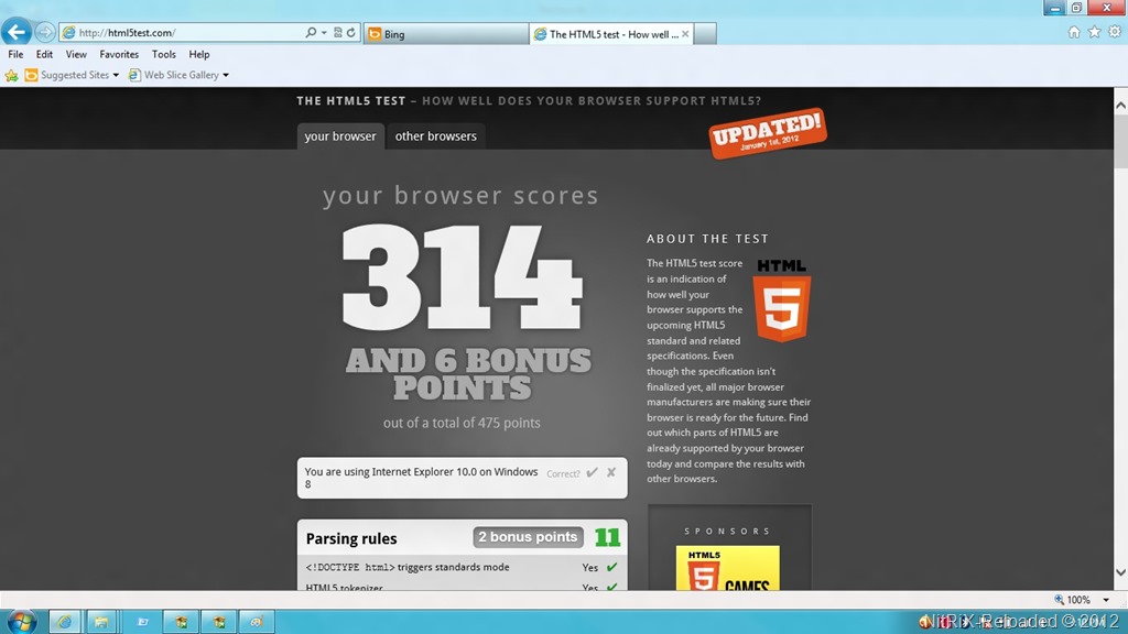 Internet Explorer 10 accompanied with Windows 8 Consumer Preview has a very good support for HTML5 comparing to IE 9.0. It scored over 314 points out of 450 when I run a test over http://www.html5test.com