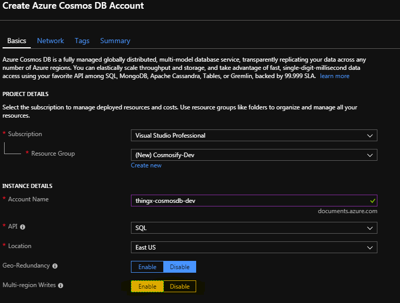 az cosmosdb create \ –-name "thingx-cosmosdb-dev" \ --resource-group "consmosify-dev" \ --default-consistency-level "Session" \ --enable-automatic-failover "true" \ --locations "EastUS=0" "WestUS=1" \ --enable-multiple-write-locations true \